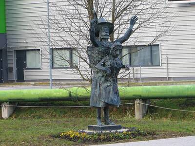 Skulptura žene z možem v košu
